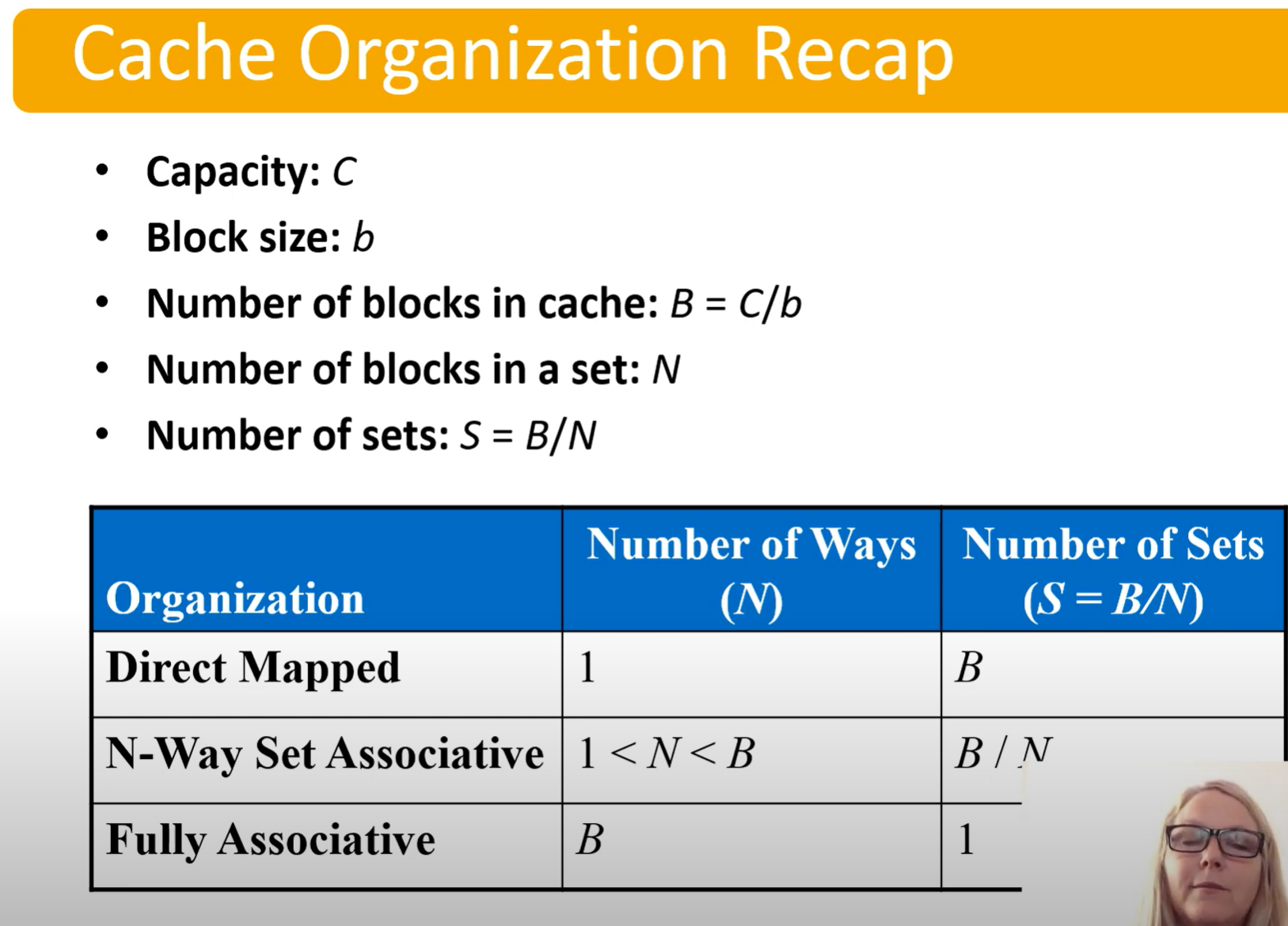 - N-way set associative: N blocks per set
