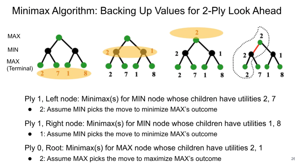 In a MIN node: We know that a higher up MAX node won’t consider this MIN node if it has the option to choose a node of value that is less than the highest found so far.
