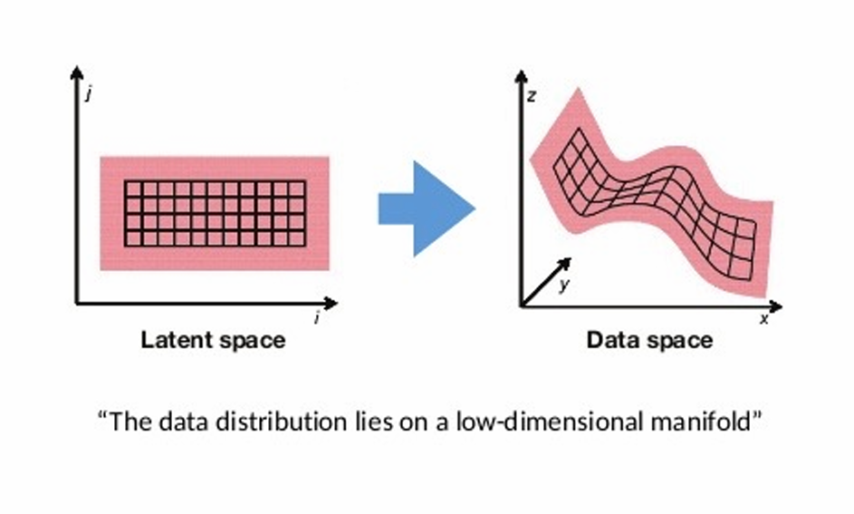 Given any point on the latent space, GAN has to map onto the Data Space on a point which looks natural. Projecting from latent space onto the manifold.