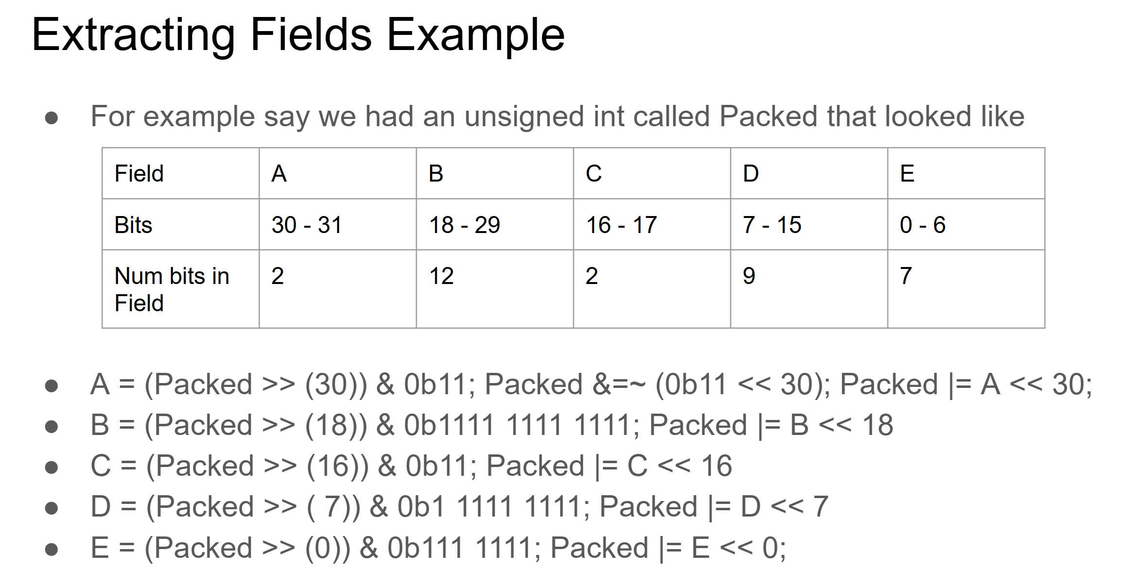 - Shift the variable containing the field to the right so that the least significant bit of the field ends up at index 0