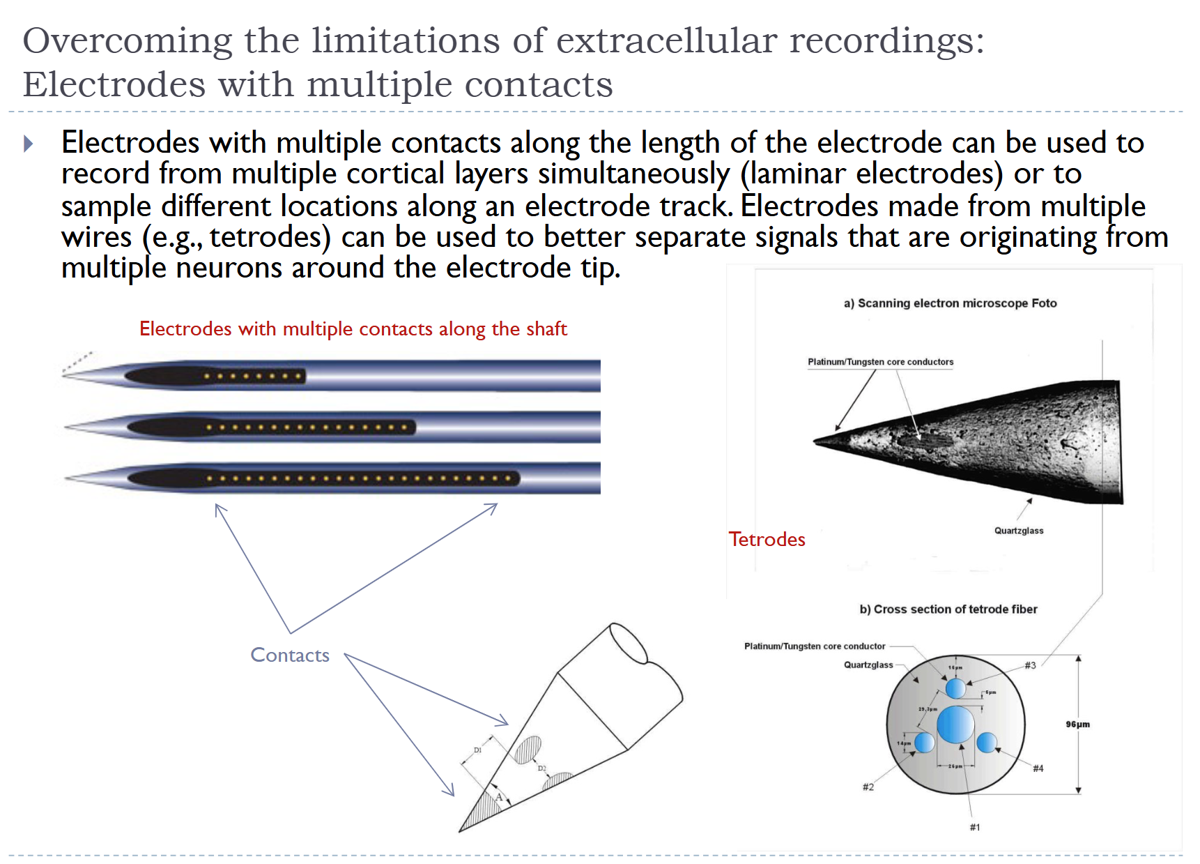 - Recent trend: high-density silicon probes, e.g., Neuropixels probe (approx. 1,000 contacts; about 400 can be selected for simultaneous recording)
