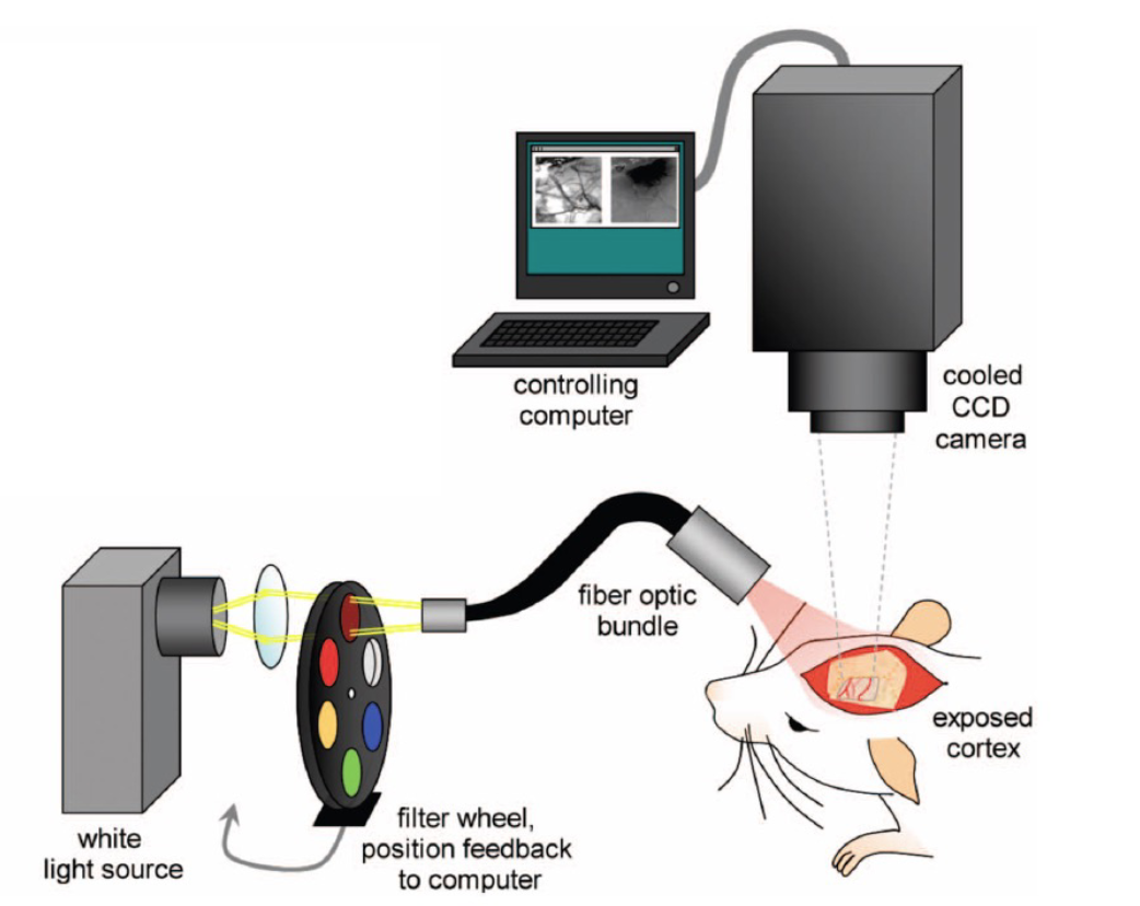 Part of the skull is removed to allow imaging of part of the cortical surface with a CCD camera to obtain a measurement of the distribution of neural activity across the cortical surface (has been influential in obtaining “maps” of visual cortex)