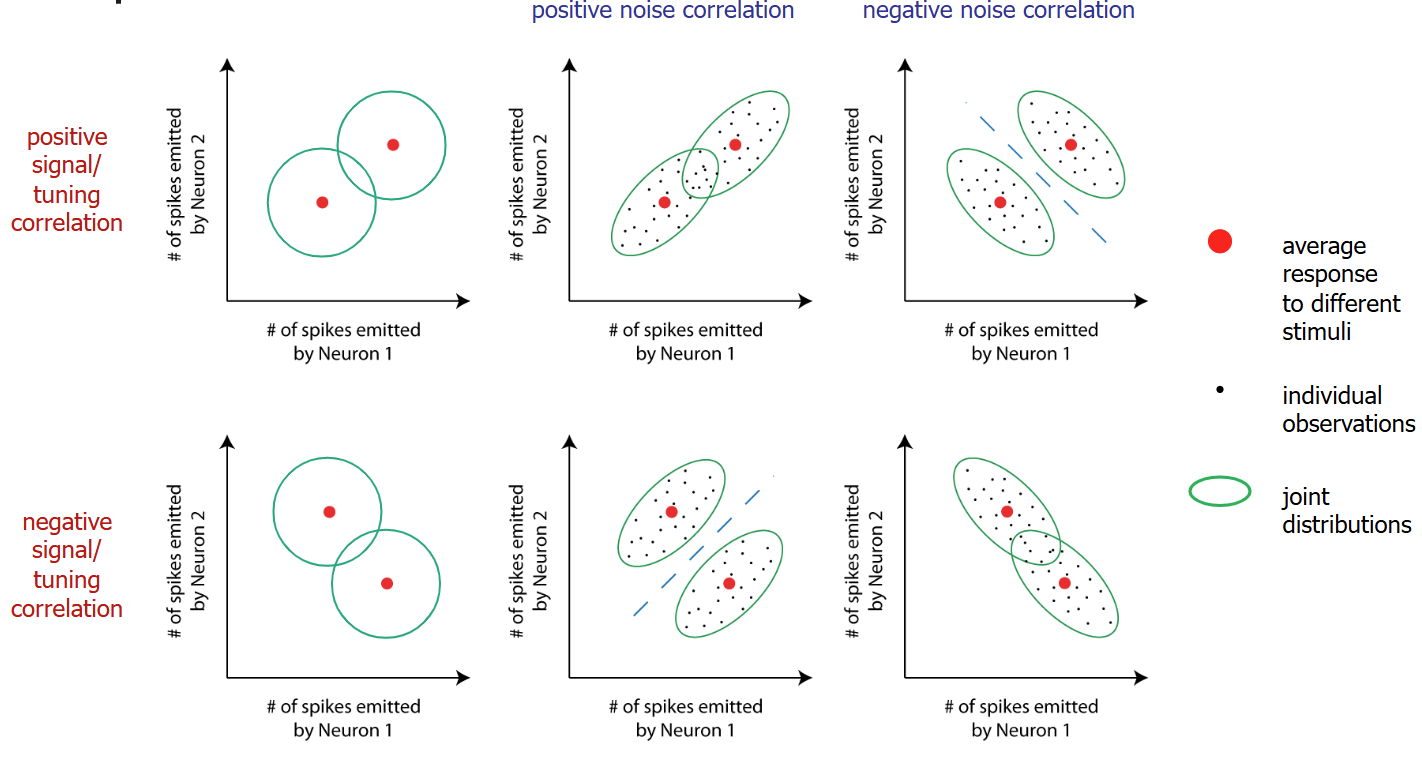 The combination of signal correlation and noise correlation has consequences for how well neural responses to different stimuli can be discriminated (see next slide for an illustration).