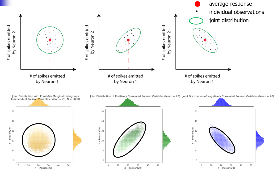 The width of the joint distribution is also important. The radius for each direction (x/y axis) tells us the number of noise variability for each neuron. ‘Thinner’ radius tells us there is lower variability in the noise
