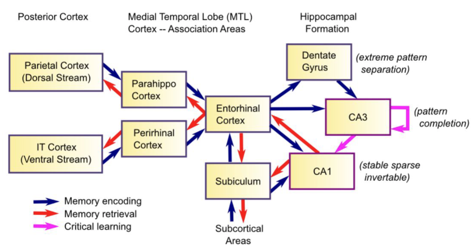 - CA1 - Forms an invertible representation. Can be used to feed into entorhinal cortex, or from.