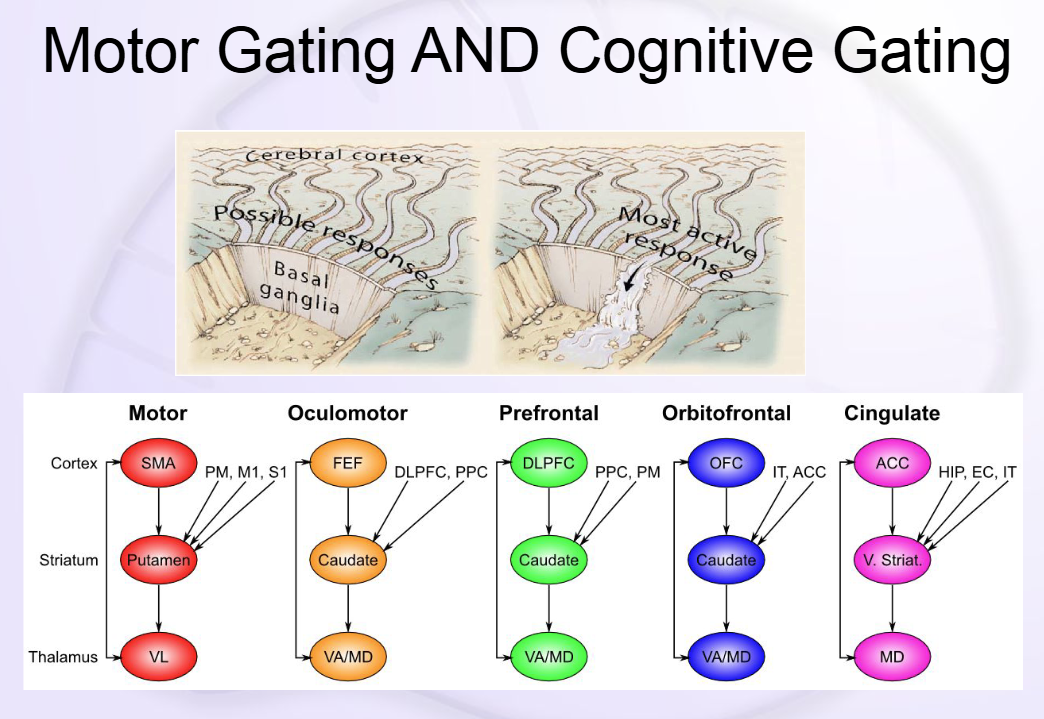 - Basal Ganglia involved in activity selection in motor functions, and in higher thinking