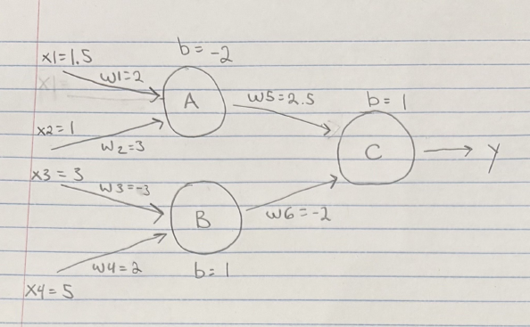 The notebook set up a two neuron network and asked you to draw a picture of the two neuron network showing the inputs, weights, and who is connected to whom. Draw that picture below.